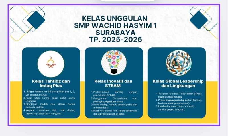 SMP Wachid Hasyim 1 Surabaya menghadirkan kelas unggulan yang dirancang untuk mengembangkan potensi akademik, spiritual, teknologi, dan kepemimpinan siswa. Program ini terbagi menjadi tiga kelas pilihan, yaitu: